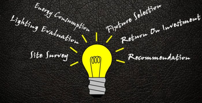 The first step to a successful lighting upgrade is the lighting survey or audit. The purpose of an audit is to assess the existing conditions and enable a comparison to be made with proposed upgrades. Lighting audit is an important step in understanding the current lighting energy costs which in turn can be utilized to plan and engineer an efficient lighting scenario.